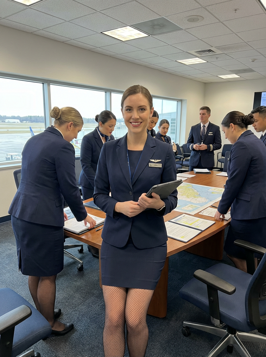 model as a flight attendant at airport briefing room, wearing a body-hugging flight attendant uniform with name badge, fishnet stockings and short skirt , preparing for flight with colleagues
