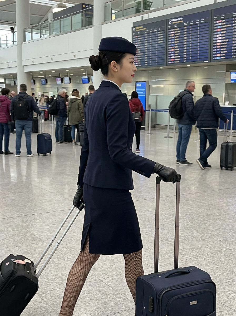 model as a flight attendant at airport terminal, wearing a figure-hugging flight attendant uniform with hat, leather gloves, fishnet stockings and thigh-high skirt , confidently pulling cabin luggage through international terminal