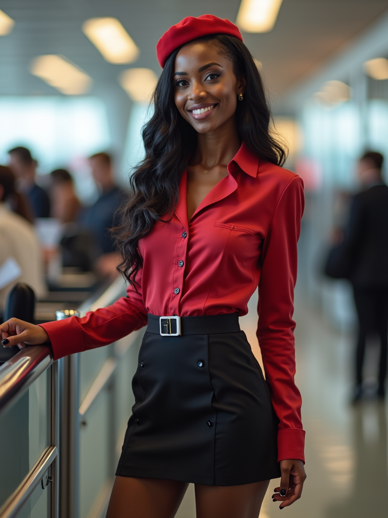 model as a flight attendant at boarding gate, wearing a seductive flight attendant uniform with perfect hair, sheer pantyhose and mini skirt , checking boarding passes