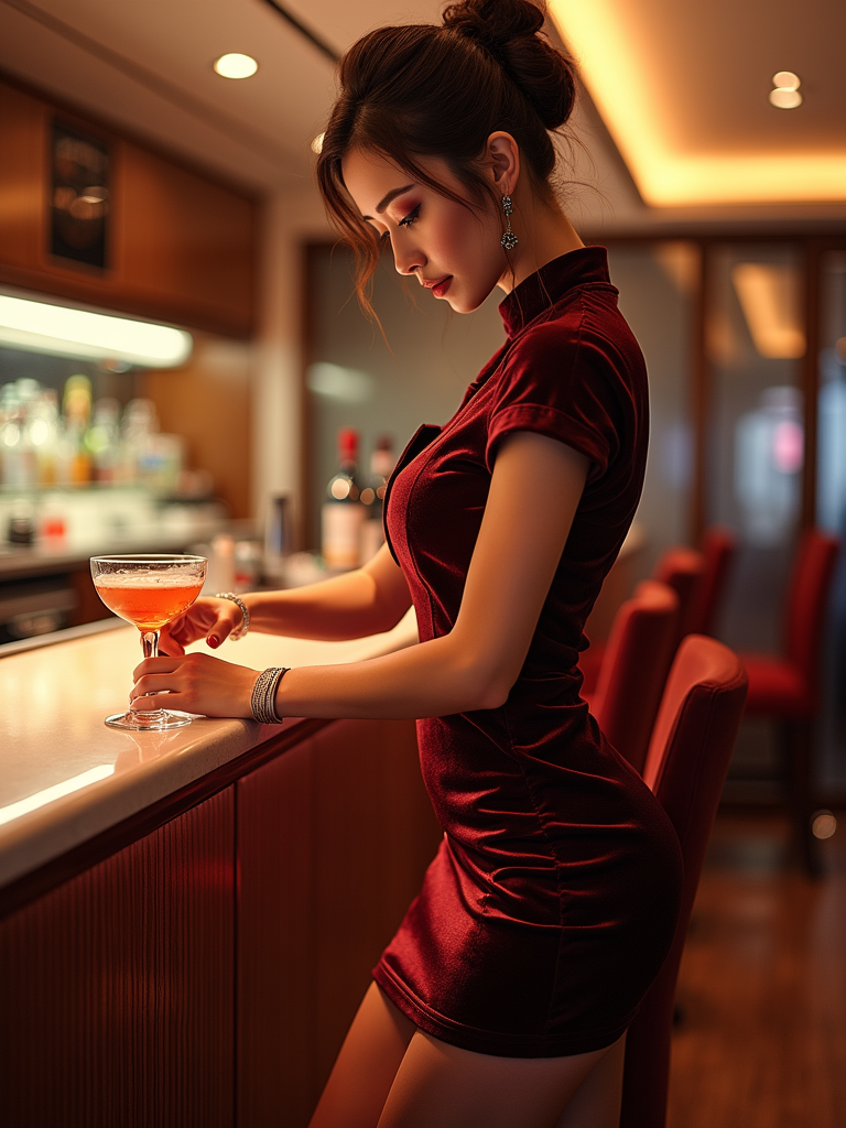model as a flight attendant at onboard bar area, wearing a seductive flight attendant uniform with smoky eye makeup, sheer stockings and thigh-high skirt , preparing specialty cocktails for passengers