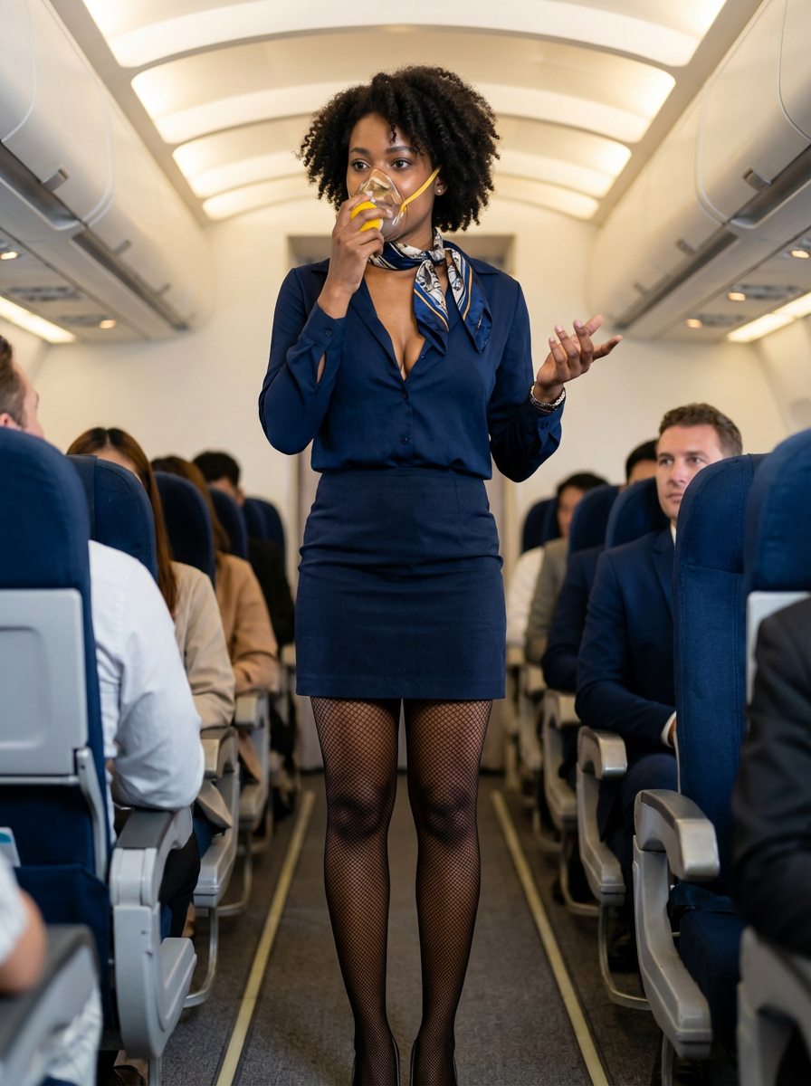 model as a flight attendant demonstrating safety procedures, wearing a sultry flight attendant uniform with low-cut top, silk scarf, fishnet stockings and short skirt , standing in the aisle with oxygen mask