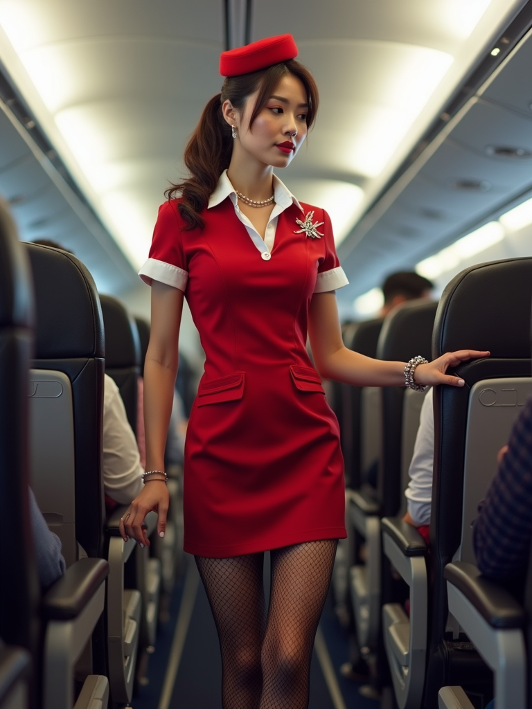 model as a flight attendant in aircraft aisle, wearing a provocative flight attendant uniform, fishnet stockings and mini skirt , performing cabin checks