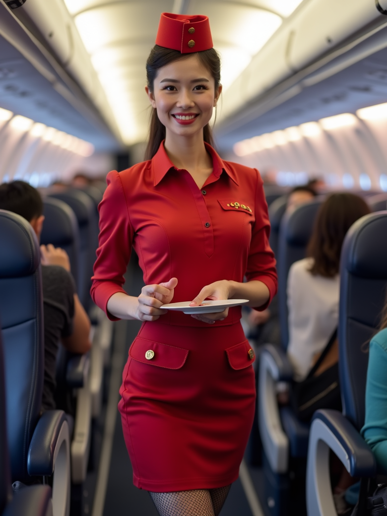 model as a flight attendant in aircraft aisle, wearing a provocative flight attendant uniform, fishnet stockings and mini skirt , performing cabin checks