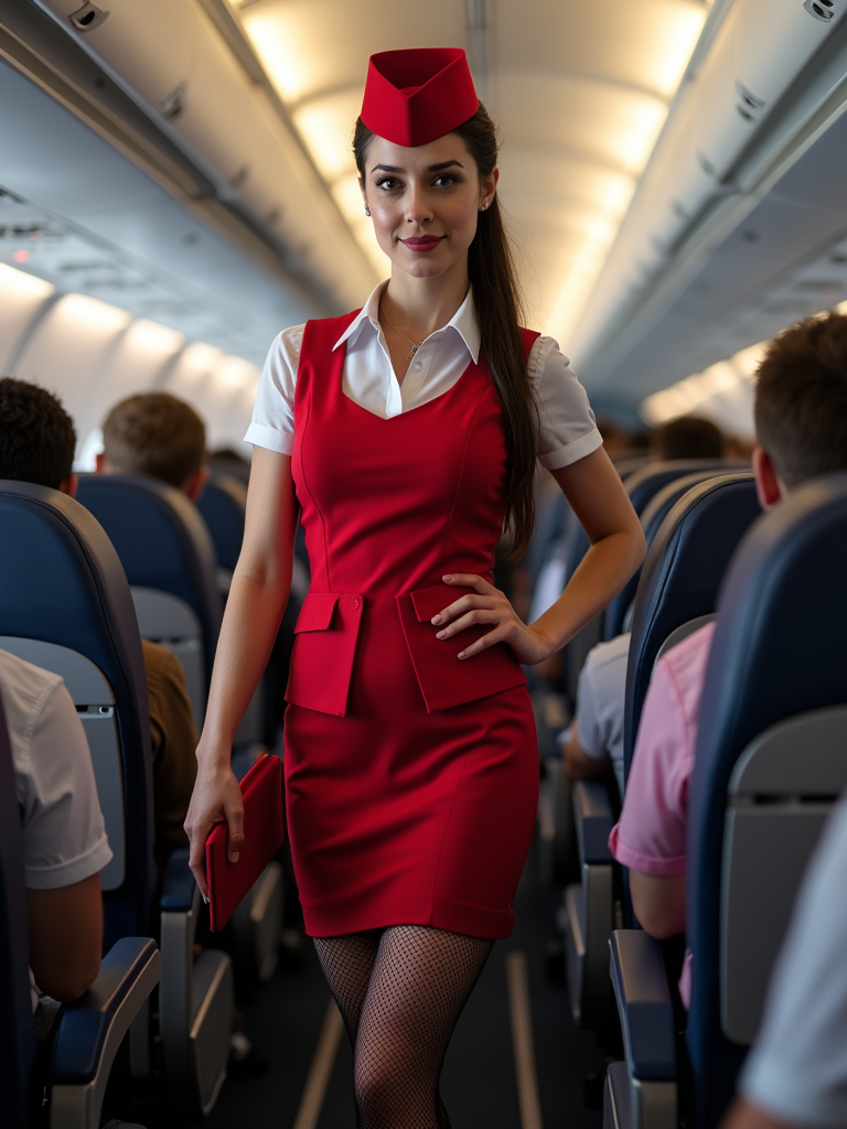 model as a flight attendant in aircraft aisle, wearing a provocative flight attendant uniform, fishnet stockings and mini skirt , performing cabin checks