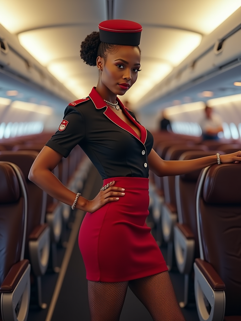 model as a flight attendant in aircraft aisle, wearing a provocative flight attendant uniform, fishnet stockings and mini skirt , performing cabin checks