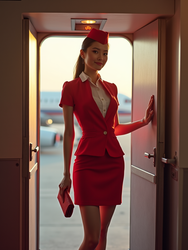 model as a flight attendant in aircraft doorway, wearing a sexy flight attendant uniform with hat, sheer stockings and thigh-high skirt , greeting passengers during boarding