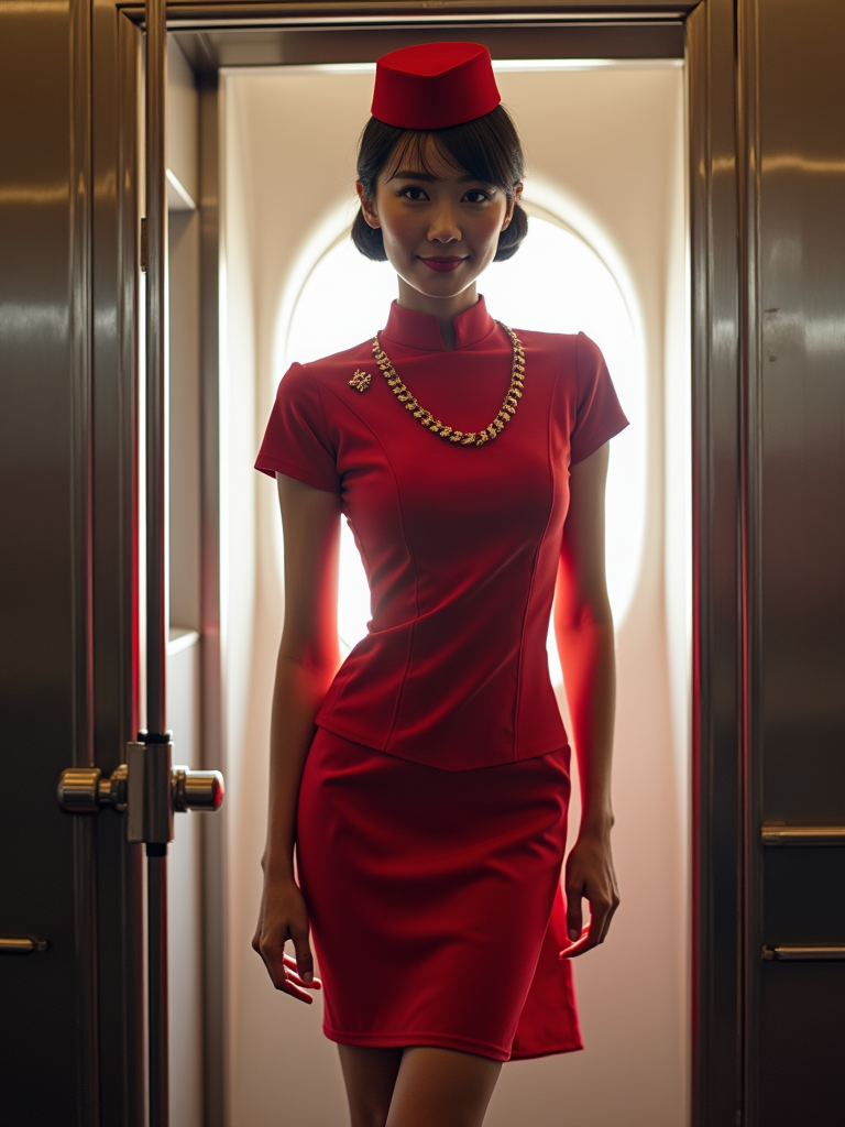 model as a flight attendant in aircraft doorway, wearing a sexy flight attendant uniform with hat, sheer stockings and thigh-high skirt , greeting passengers during boarding