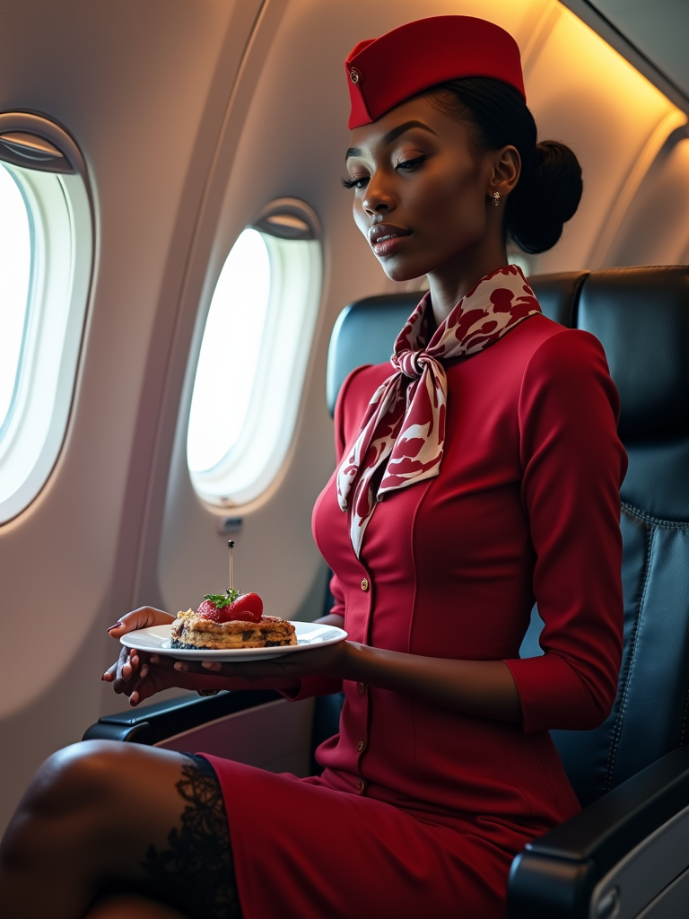 model as a flight attendant in business class, wearing a provocative flight attendant uniform with silk scarf, lace stockings and thigh-high skirt , serving gourmet meals on long-haul flight