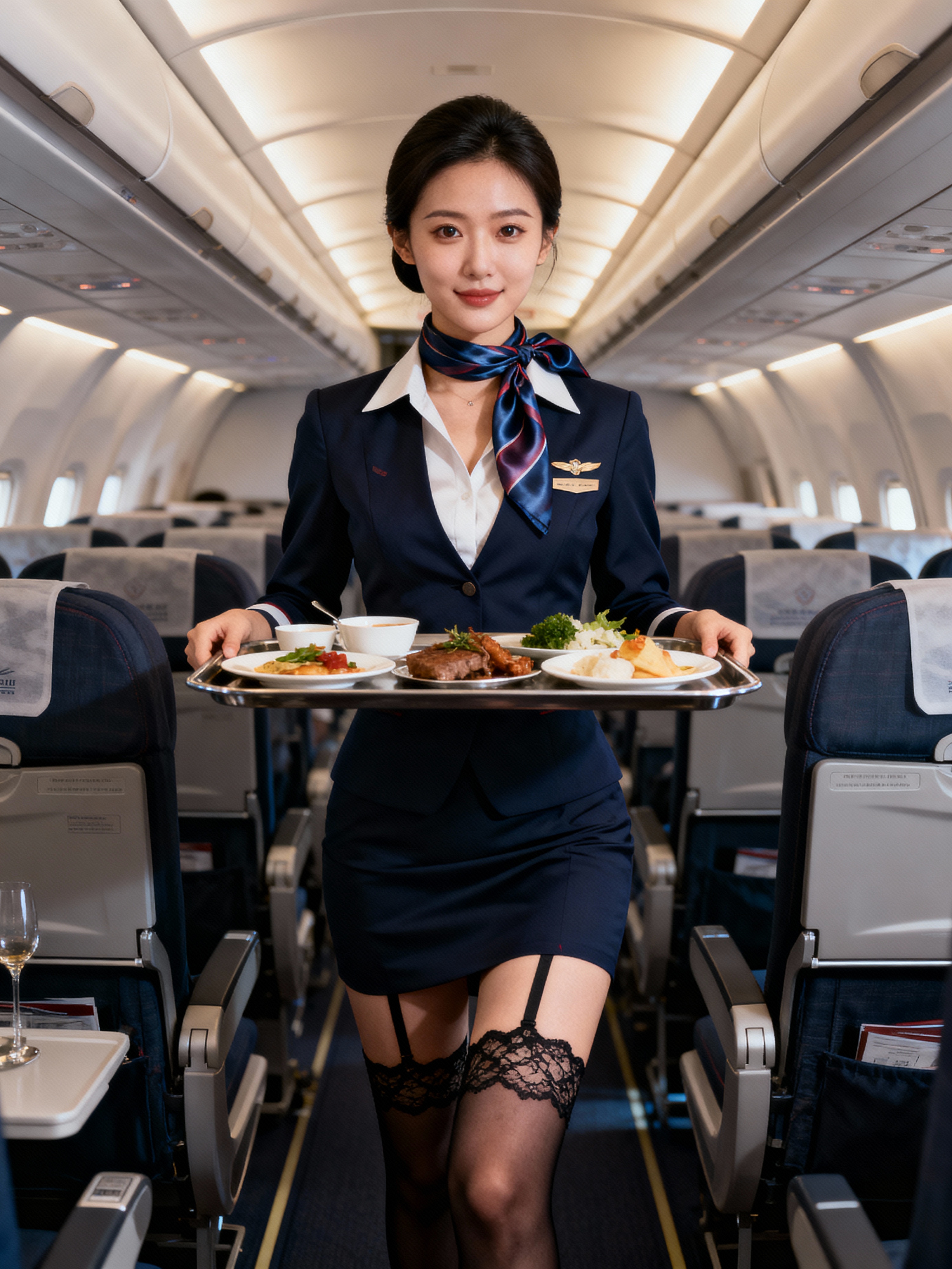 model as a flight attendant in business class, wearing a provocative flight attendant uniform with silk scarf, lace stockings and thigh-high skirt , serving gourmet meals on long-haul flight
