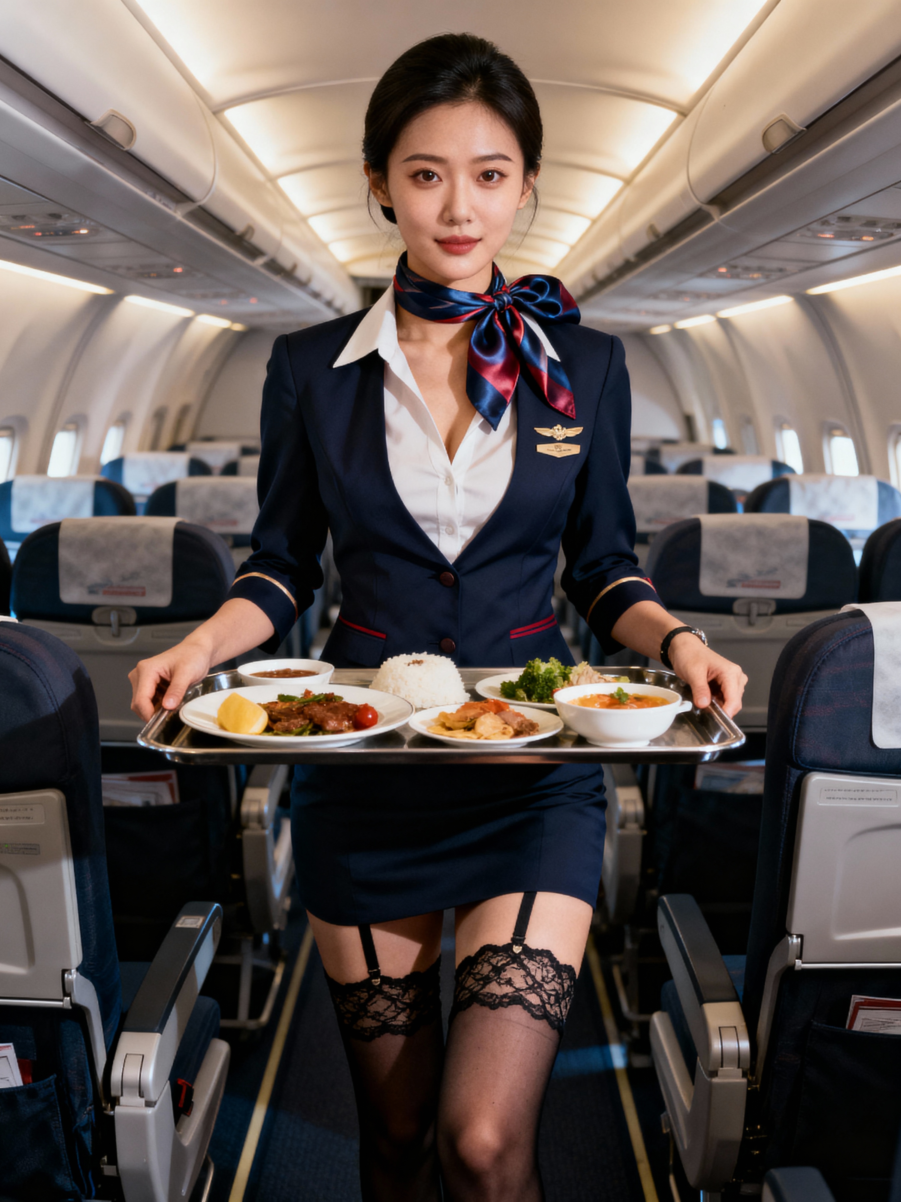 model as a flight attendant in business class, wearing a provocative flight attendant uniform with silk scarf, lace stockings and thigh-high skirt , serving gourmet meals on long-haul flight