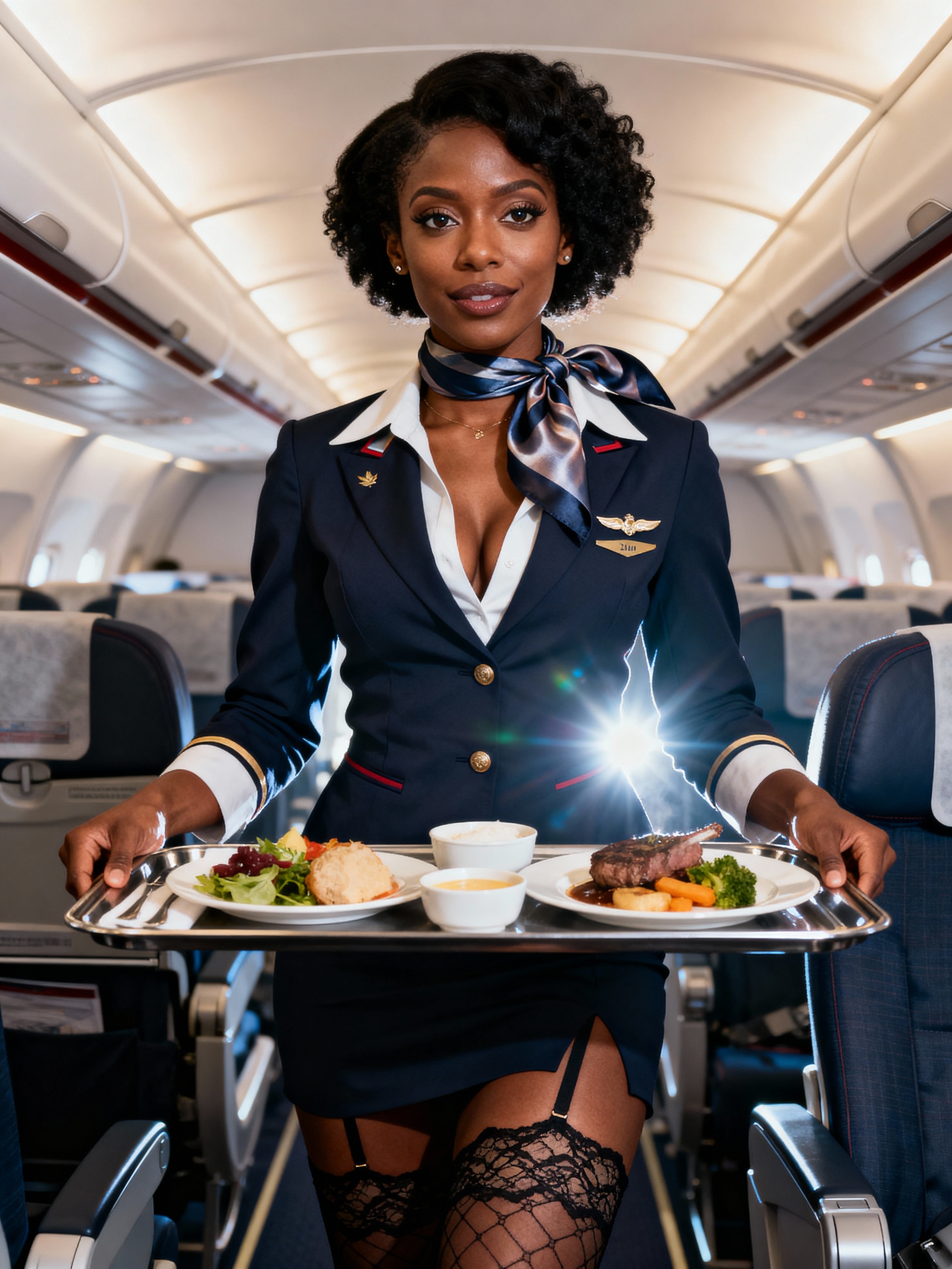 model as a flight attendant in business class, wearing a provocative flight attendant uniform with silk scarf, lace stockings and thigh-high skirt , serving gourmet meals on long-haul flight