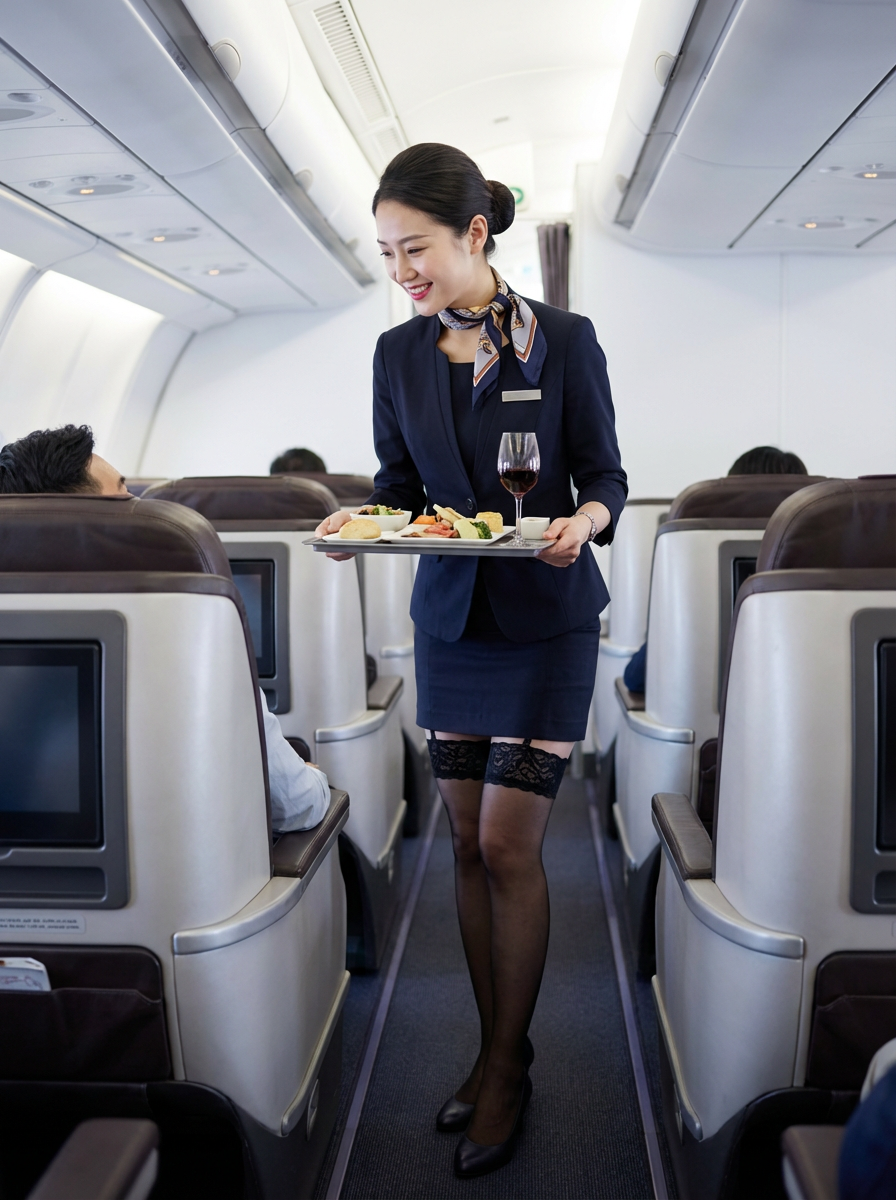 model as a flight attendant in business class, wearing a provocative flight attendant uniform with silk scarf, lace stockings and thigh-high skirt , serving gourmet meals on long-haul flight