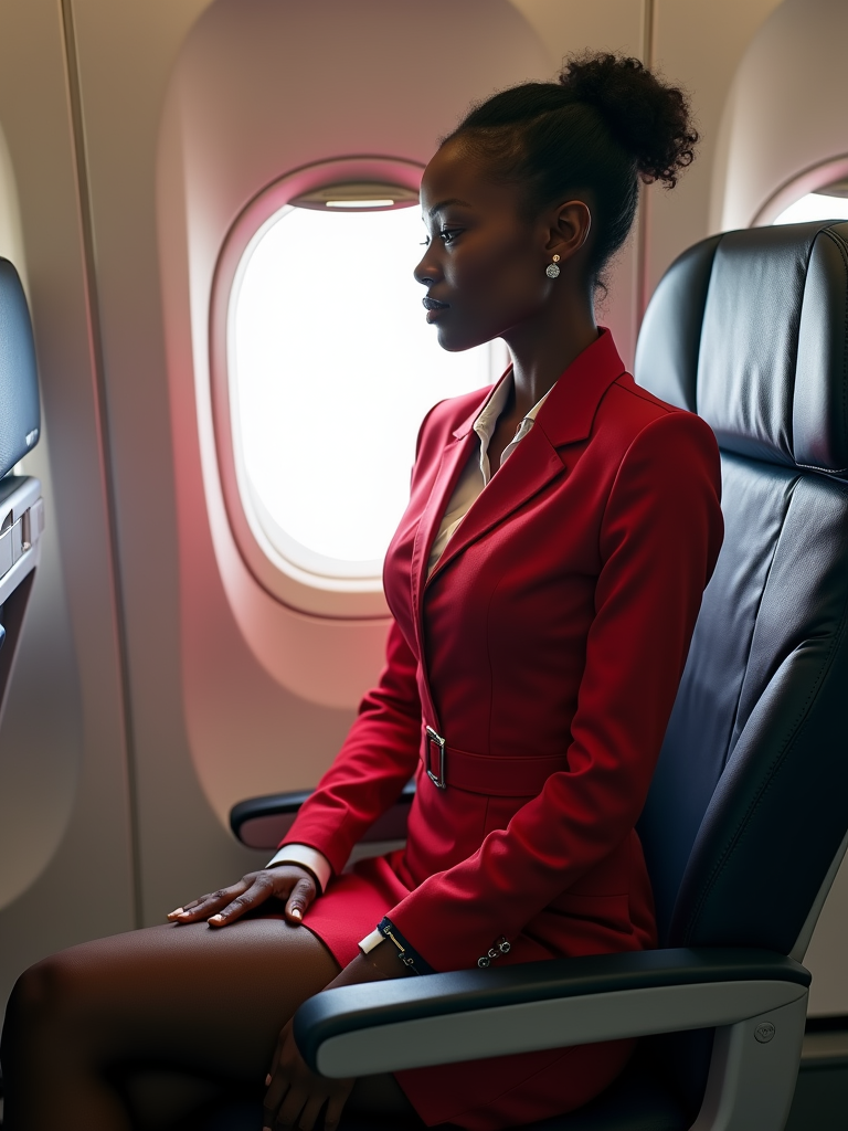 model as a flight attendant in jumpseat, wearing a tight flight attendant uniform with seatbelt, sheer pantyhose and short skirt , preparing for landing