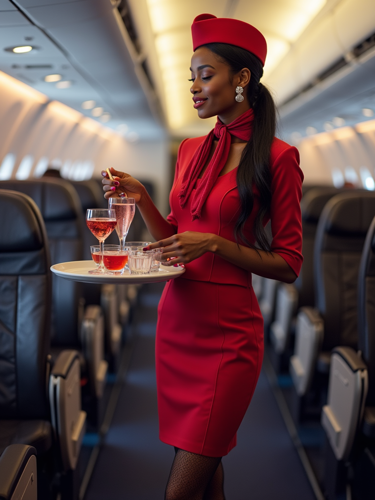model as a flight attendant in premium economy section, wearing a body-hugging flight attendant uniform with scarf, lace stockings and thigh-high skirt , serving refreshments from trolley