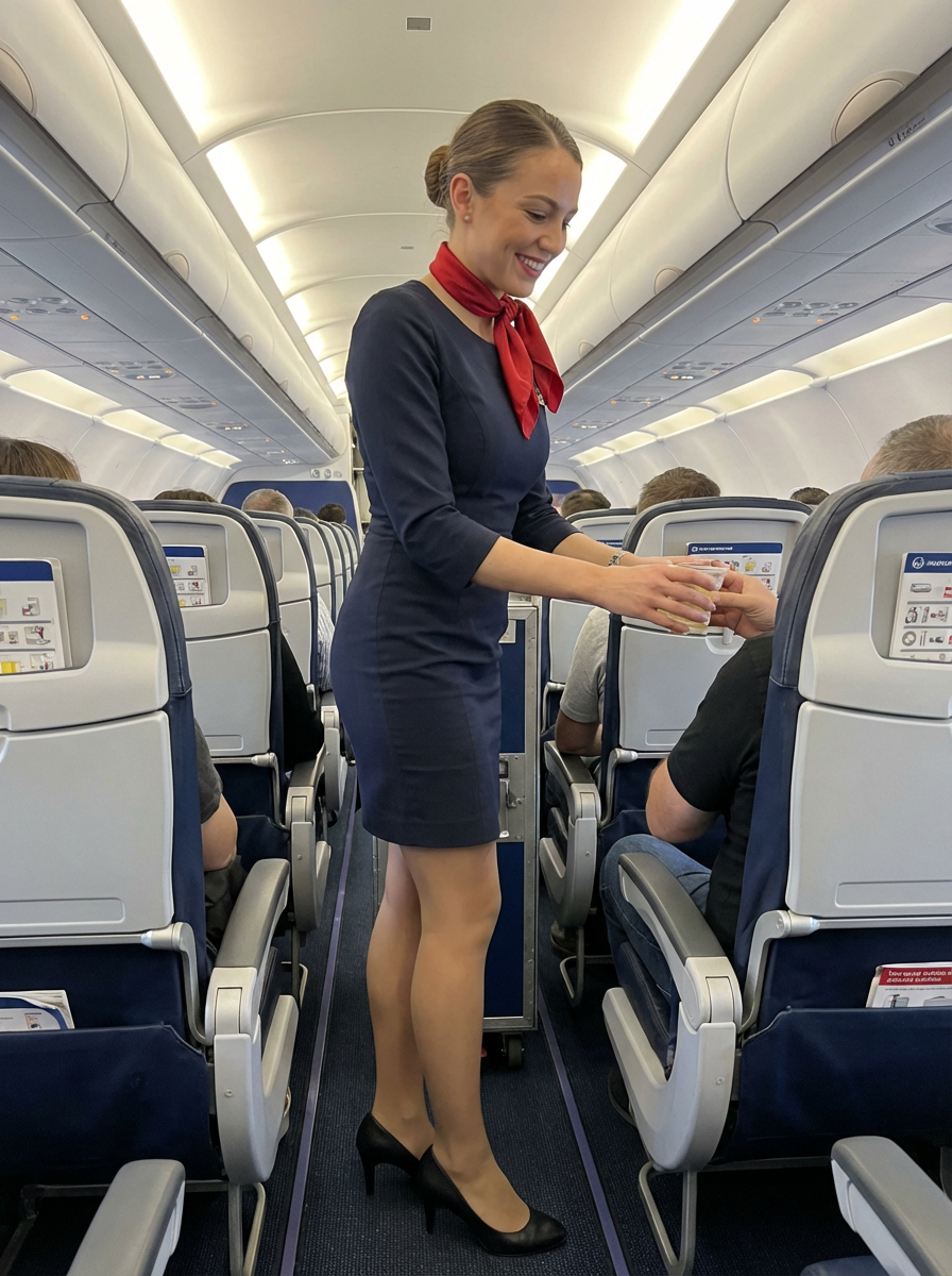 model as a flight attendant in the airplane cabin, wearing a form-fitting navy blue flight attendant uniform, red silk scarf, sheer pantyhose, short skirt and stiletto heels , seductive smile while serving passengers