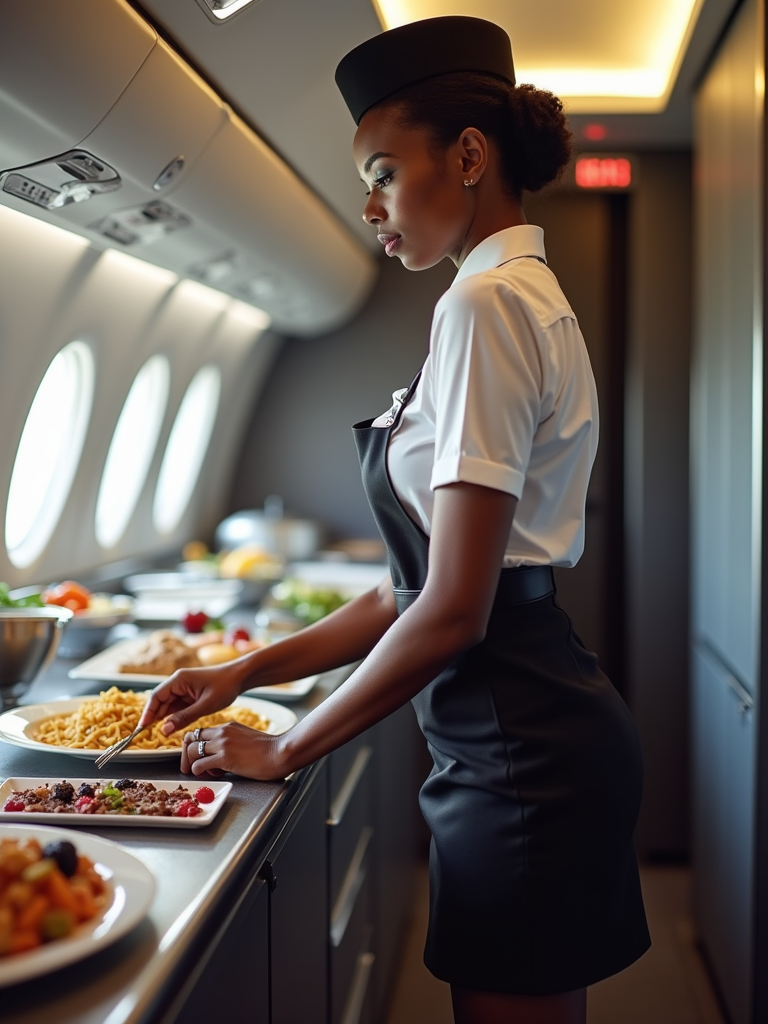 model as a flight attendant in the galley of a modern aircraft, wearing a tight flight attendant uniform with smoky eye makeup, sheer stockings and mini skirt , preparing meal service