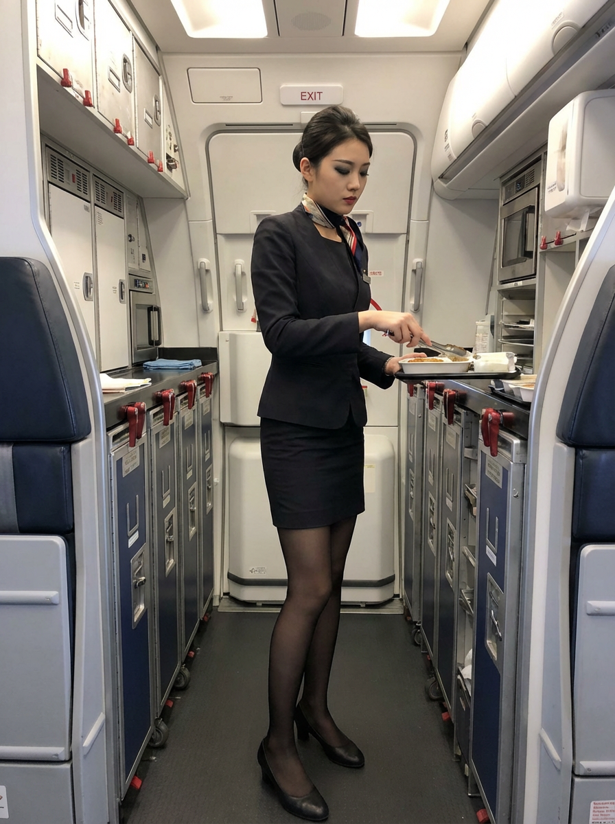 model as a flight attendant in the galley of a modern aircraft, wearing a tight flight attendant uniform with smoky eye makeup, sheer stockings and mini skirt , preparing meal service