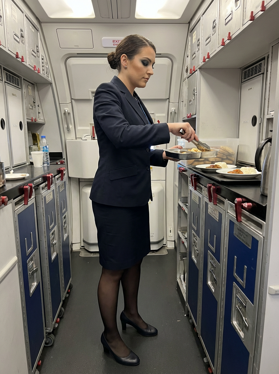 model as a flight attendant in the galley of a modern aircraft, wearing a tight flight attendant uniform with smoky eye makeup, sheer stockings and mini skirt , preparing meal service
