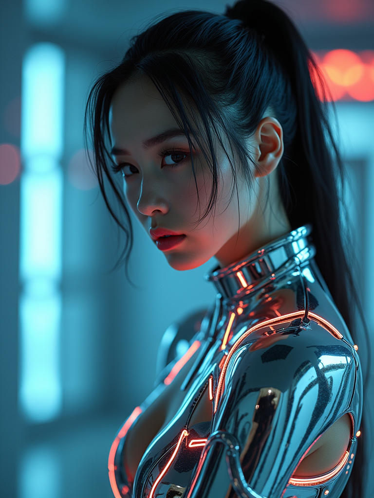 model as a futuristic AI, studio setup, wearing a sleek chrome bodysuit with LED accents , sci-fi lighting and digital effects