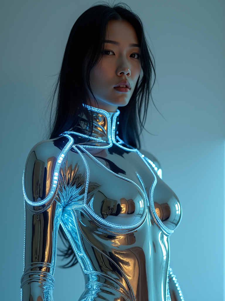 model as a futuristic AI, studio setup, wearing a sleek chrome bodysuit with LED accents , sci-fi lighting and digital effects