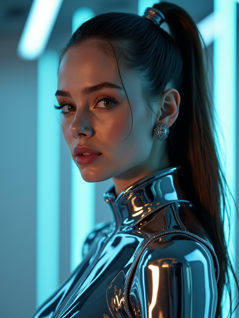 model as a futuristic AI, studio setup, wearing a sleek chrome bodysuit with LED accents , sci-fi lighting and digital effects