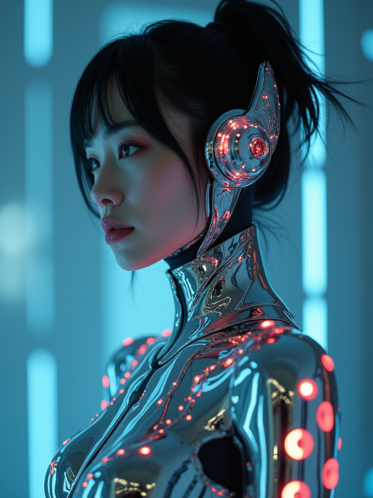 model as a futuristic AI, studio setup, wearing a sleek chrome bodysuit with LED accents , sci-fi lighting and digital effects
