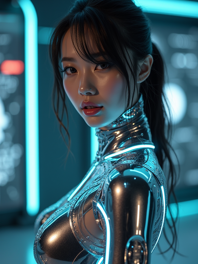 model as a futuristic AI, studio setup, wearing a sleek chrome bodysuit with LED accents , sci-fi lighting and digital effects
