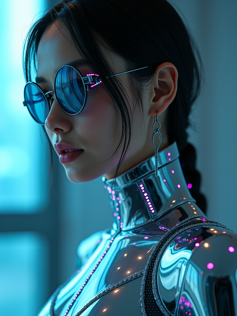 model as a futuristic AI, studio setup, wearing a sleek chrome bodysuit with LED accents , sci-fi lighting and digital effects