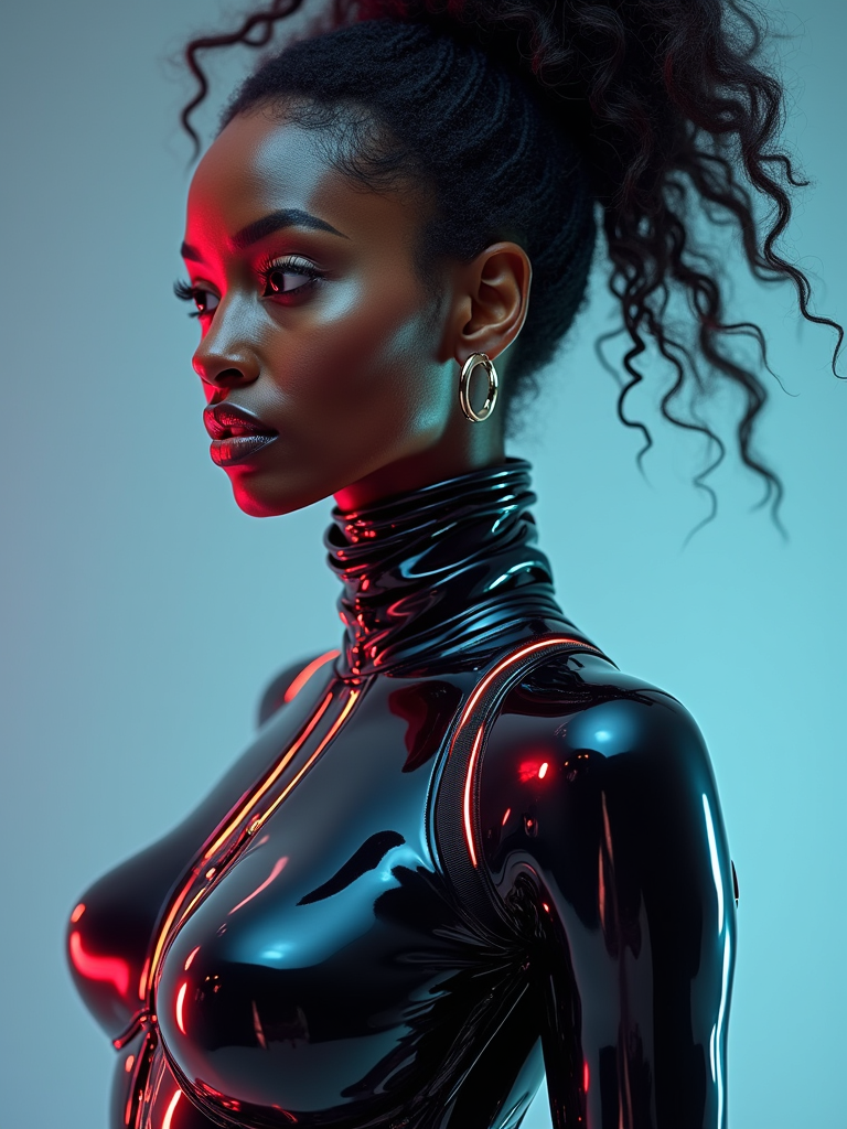 model as a futuristic AI, studio setup, wearing a sleek chrome bodysuit with LED accents , sci-fi lighting and digital effects