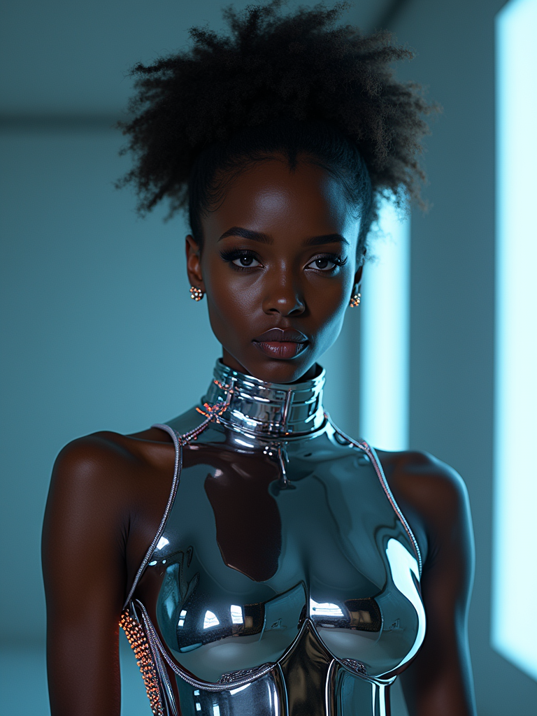model as a futuristic AI, studio setup, wearing a sleek chrome bodysuit with LED accents , sci-fi lighting and digital effects