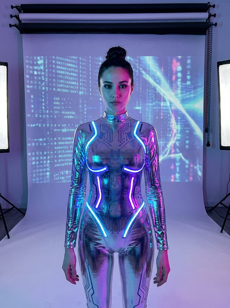 model as a futuristic AI, studio setup, wearing a sleek chrome bodysuit with LED accents , sci-fi lighting and digital effects