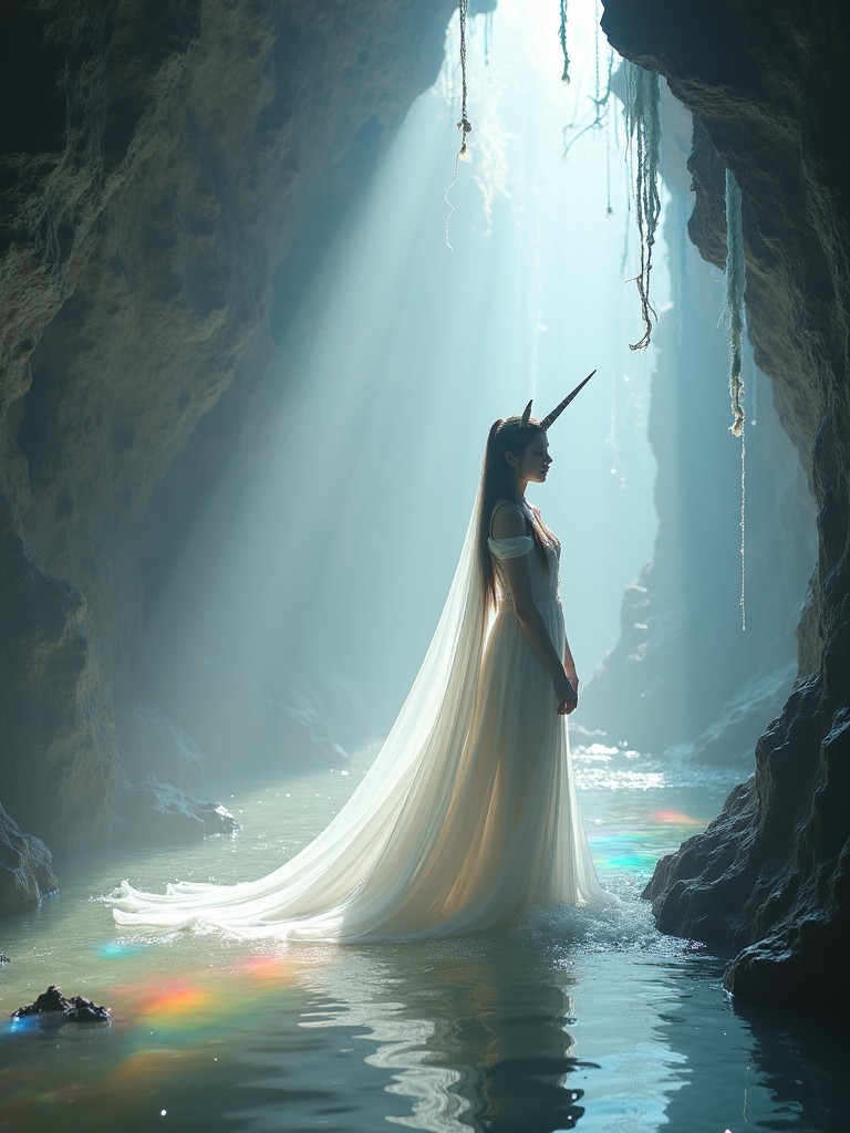 model as a gentle unicorn whisperer in flowing white and silver in a crystal cave with a family of unicorns, prismatic light creating rainbow reflections everywhere