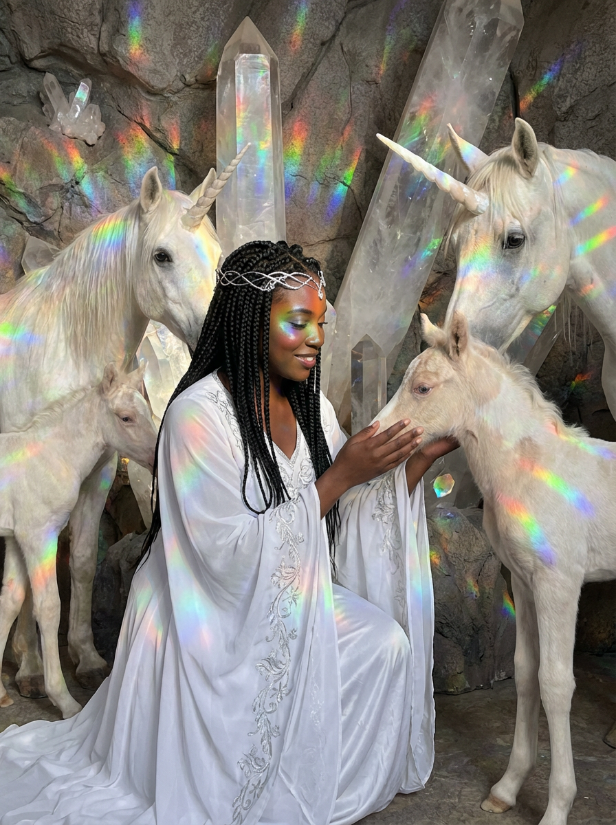 model as a gentle unicorn whisperer in flowing white and silver in a crystal cave with a family of unicorns, prismatic light creating rainbow reflections everywhere