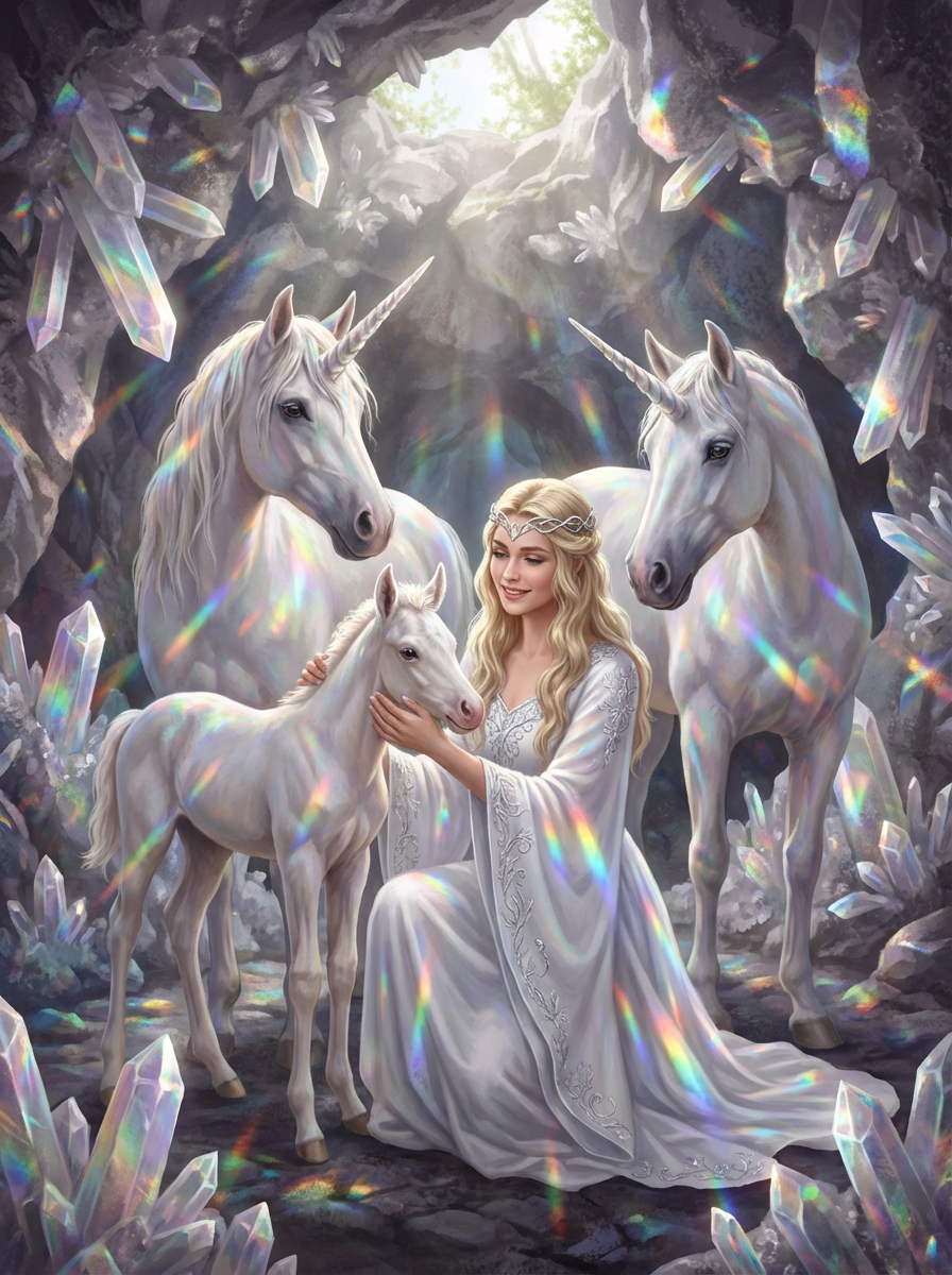 model as a gentle unicorn whisperer in flowing white and silver in a crystal cave with a family of unicorns, prismatic light creating rainbow reflections everywhere