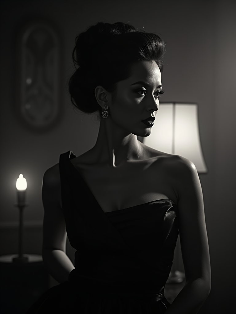 model as a glamorous 1950s noir starlet in a dimly lit film set, wearing a luxurious satin evening gown , sophisticated updo hairstyle , dramatic lighting creating shadows, high-contrast black and white photography, art deco backdrop