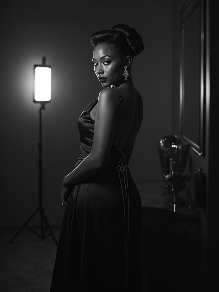 model as a glamorous 1950s noir starlet in a dimly lit film set, wearing a luxurious satin evening gown , sophisticated updo hairstyle , dramatic lighting creating shadows, high-contrast black and white photography, art deco backdrop