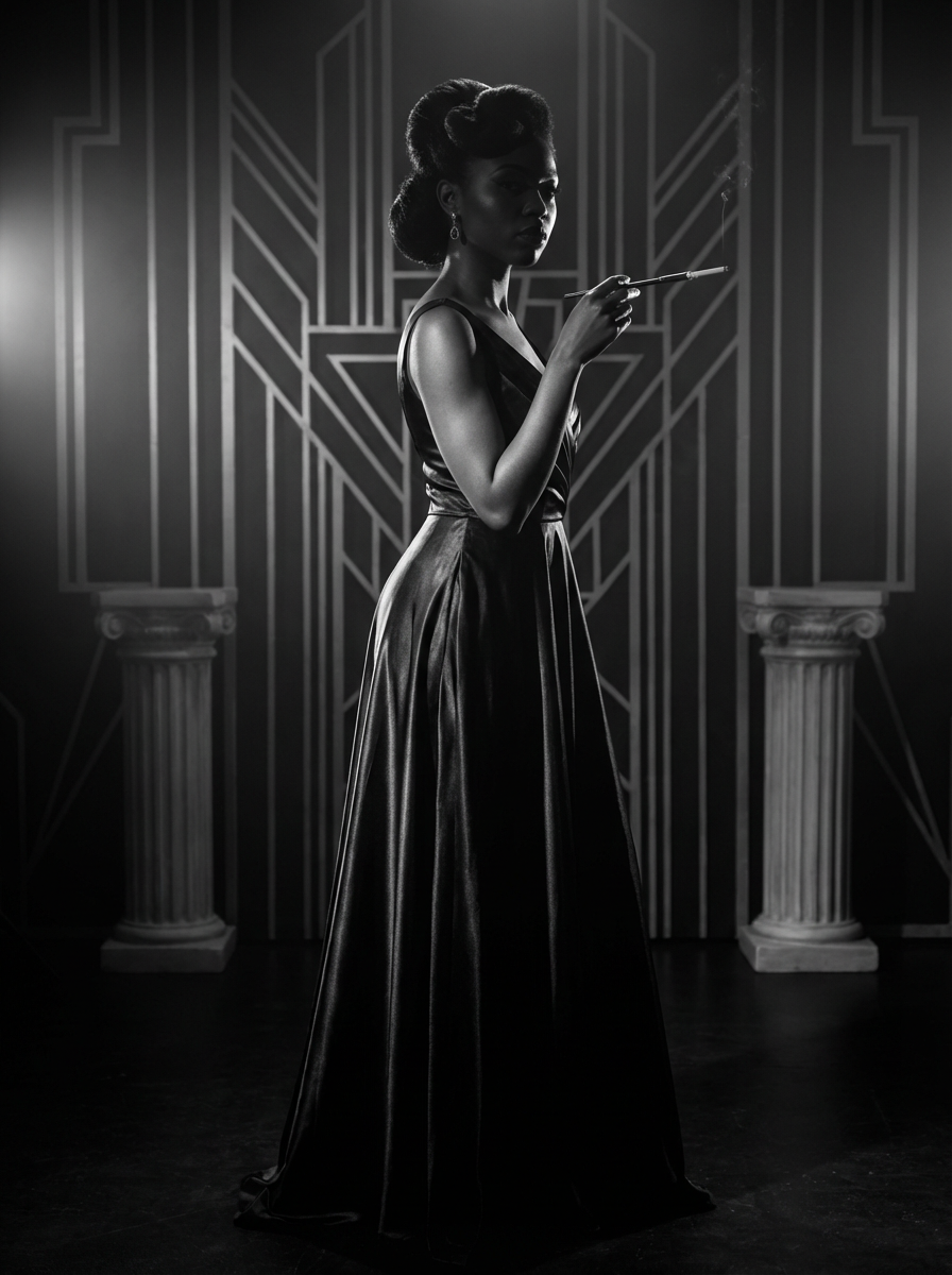 model as a glamorous 1950s noir starlet in a dimly lit film set, wearing a luxurious satin evening gown , sophisticated updo hairstyle , dramatic lighting creating shadows, high-contrast black and white photography, art deco backdrop