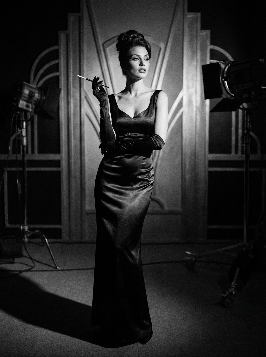 model as a glamorous 1950s noir starlet in a dimly lit film set, wearing a luxurious satin evening gown , sophisticated updo hairstyle , dramatic lighting creating shadows, high-contrast black and white photography, art deco backdrop