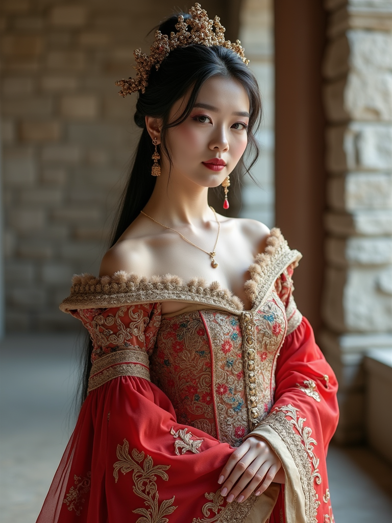 model as a historical character, castle backdrop, wearing a medieval princess gown with intricate embroidery , posing regally