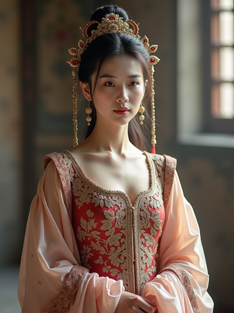 model as a historical character, castle backdrop, wearing a medieval princess gown with intricate embroidery , posing regally