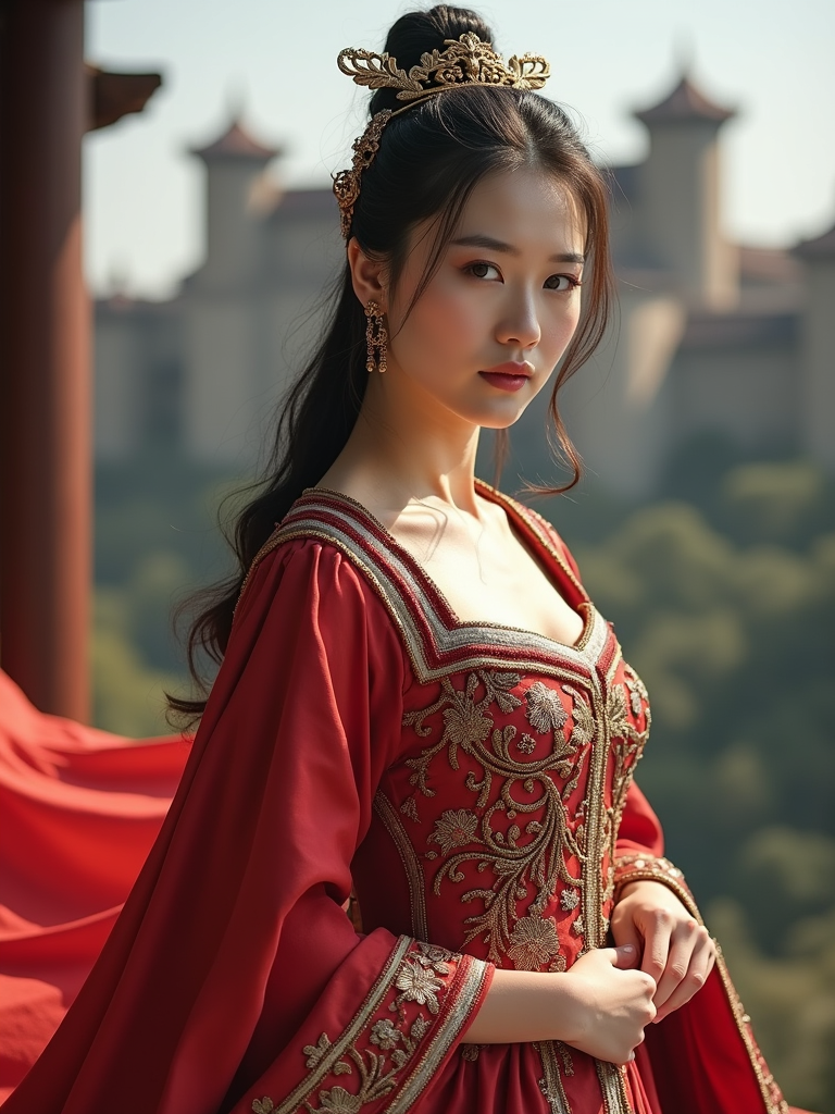 model as a historical character, castle backdrop, wearing a medieval princess gown with intricate embroidery , posing regally