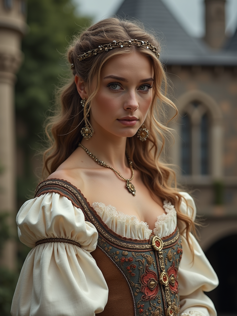 model as a historical character, castle backdrop, wearing a medieval princess gown with intricate embroidery , posing regally