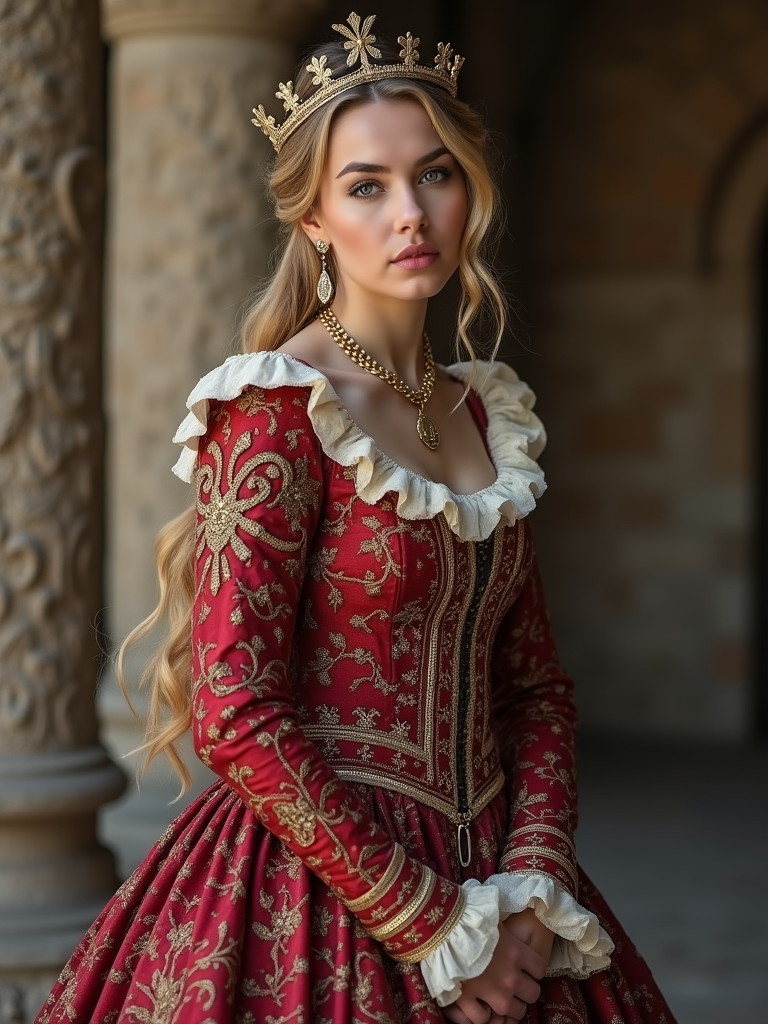 model as a historical character, castle backdrop, wearing a medieval princess gown with intricate embroidery , posing regally