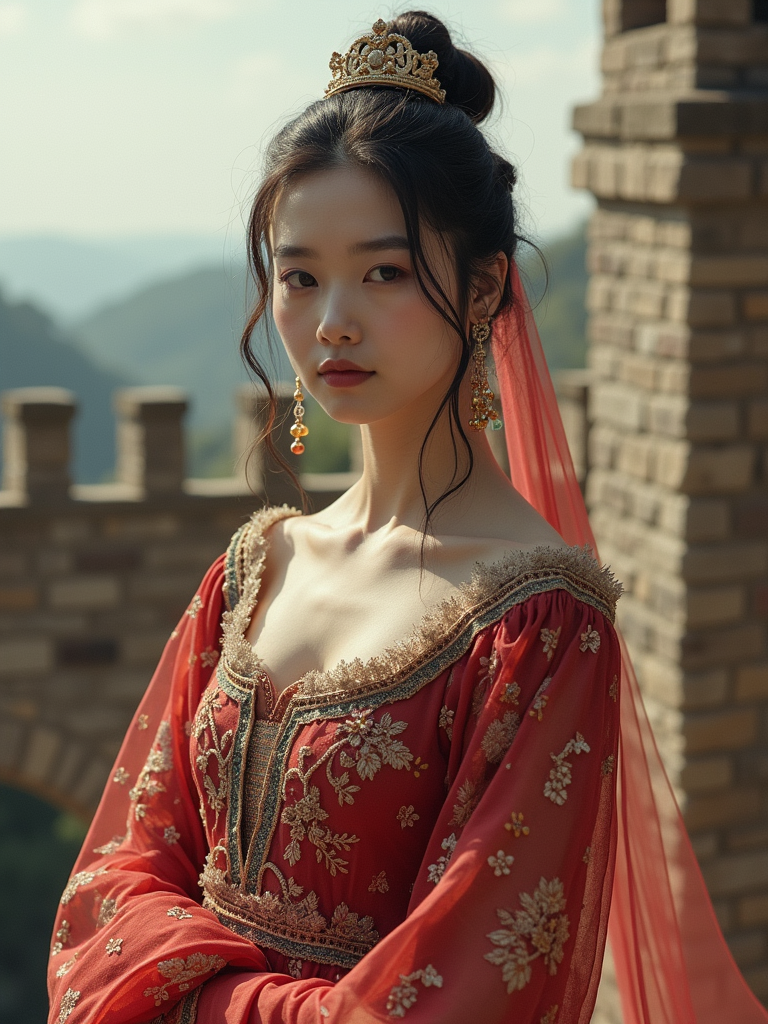 model as a historical character, castle backdrop, wearing a medieval princess gown with intricate embroidery , posing regally