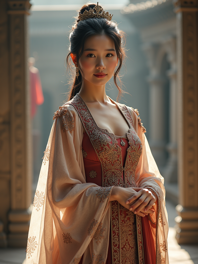 model as a historical character, castle backdrop, wearing a medieval princess gown with intricate embroidery , posing regally