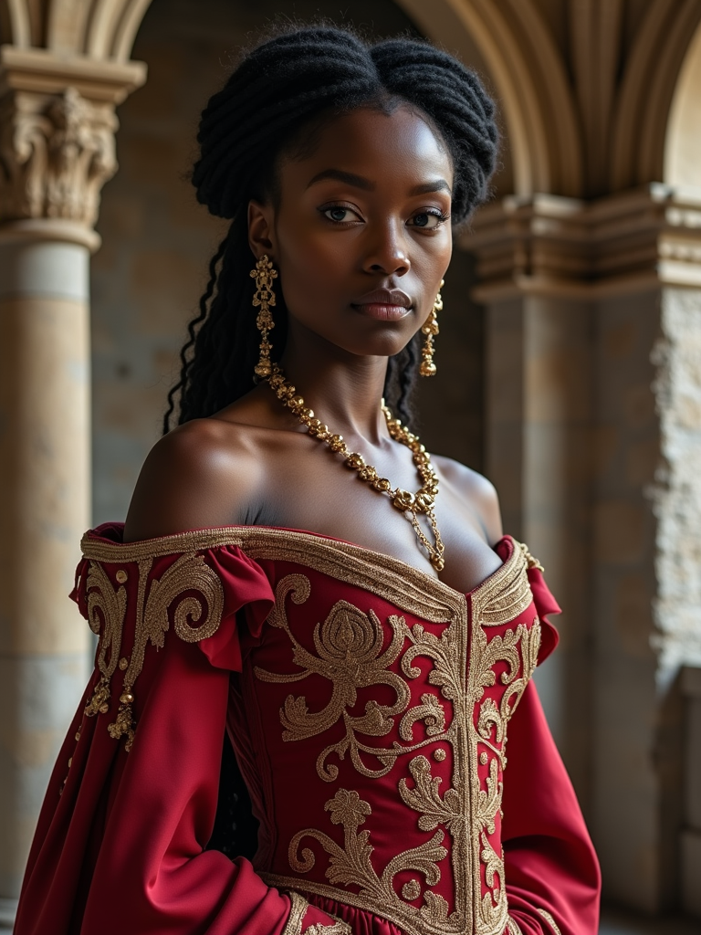 model as a historical character, castle backdrop, wearing a medieval princess gown with intricate embroidery , posing regally