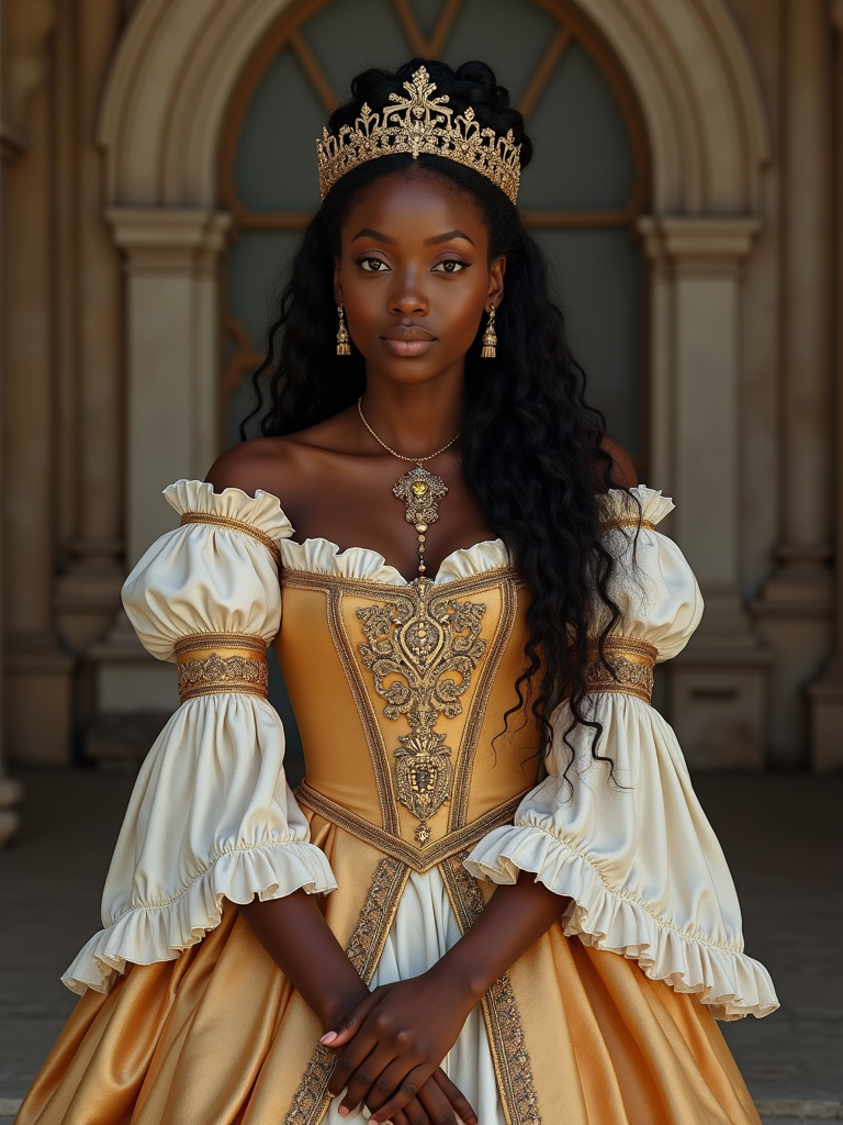model as a historical character, castle backdrop, wearing a medieval princess gown with intricate embroidery , posing regally