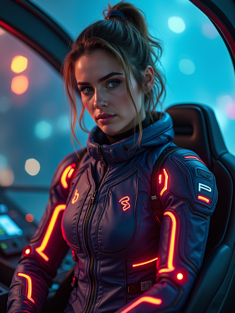 model as a mech pilot, studio setting, wearing a neon-lit tech jumpsuit , dramatic lighting, cockpit background
