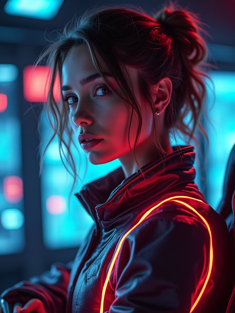 model as a mech pilot, studio setting, wearing a neon-lit tech jumpsuit , dramatic lighting, cockpit background