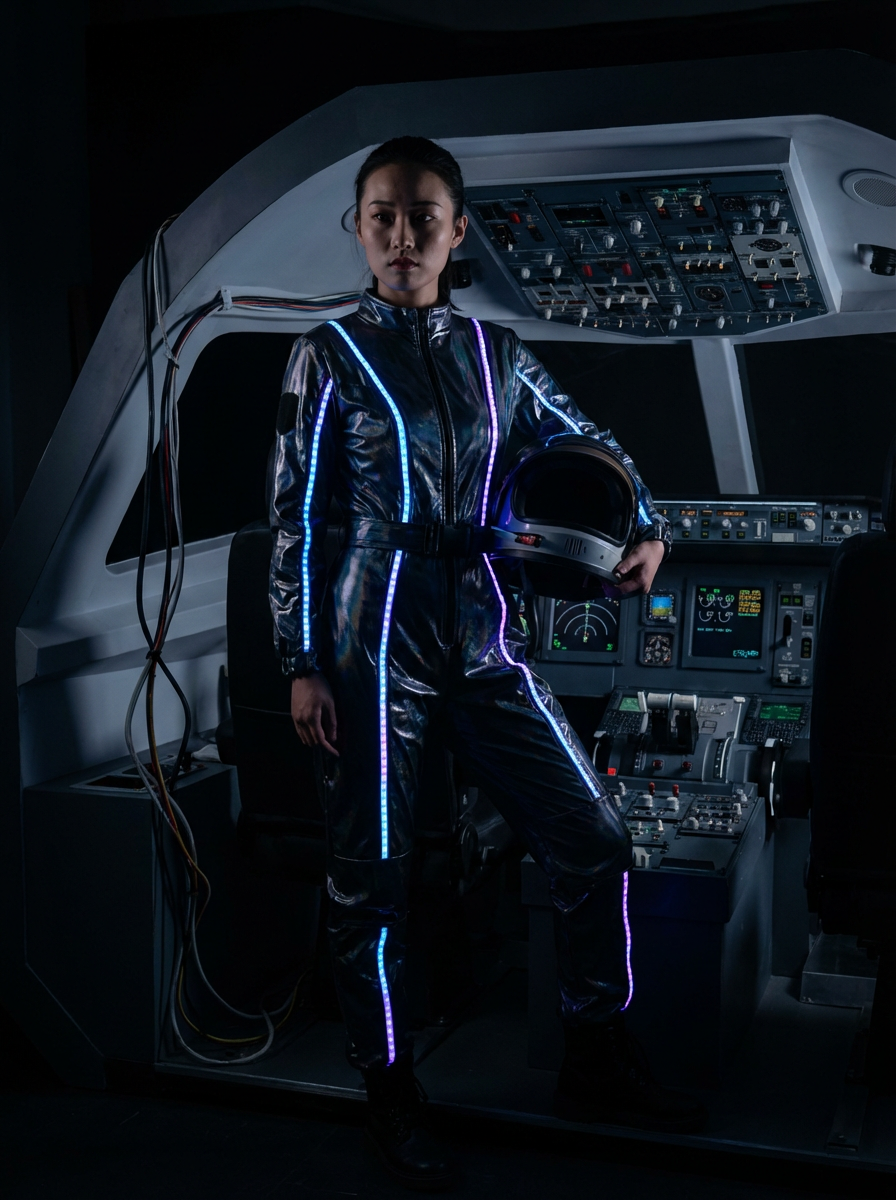 model as a mech pilot, studio setting, wearing a neon-lit tech jumpsuit , dramatic lighting, cockpit background